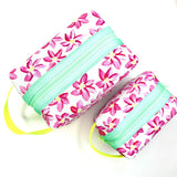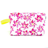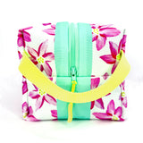 Big and boxy never looked so beautiful! This large structured travel toiletry bag is fabricated with Sun + Song's exclusive Breezy Blooms fabric. Our Breezy Blooms design features a carefree array of hot pink flowers, hand painted with yellowy green centers on a crisp white background. The aqua blue zipper wraps over the top and down part of each side, opening wide to reveal a charcoal grey waterproof canvas interior. Grab this pouch by its neon yellow handle and you're good to go!