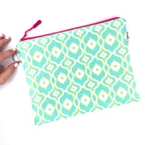 Don't settle for a boring bag! This highly functional and lively looking water-resistant wet bag is produced using Sun + Song's exclusive Woven Chain fabric. Our Woven Chain design features curvy yet geometric lines in lemon yellow and crisp white, weaving in and out of each other over an aqua blue background. Open up this bag's hot pink zipper to find a fun pop of hot pink waterproof fabric lining the inside!