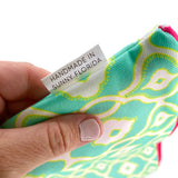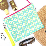 Want to show off your style? Clip on a Sun + Song wristlet strap (sold separately) to the sewn-in metal D ring and carry this pouch as a colorful clutch!