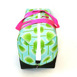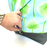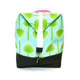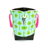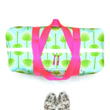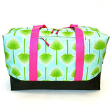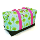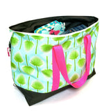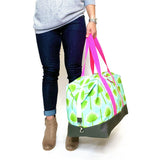 Take your whimsy with you when you go! This thoughtfully designed weekender tote is expertly sewn using Sun + Song's exclusive Palmetto Leaves fabric. Our Palmetto Leaves design features grid of flip flopping sabal palmetto fronds in rich chartreuse green on an aqua blue background. This hardy palm serves as the state tree of both Florida and South Carolina. The hot pink straps and aqua blue zipper on the front pocket colorfully complete the exterior of this big bag. Inside you'll find low maintenance charcoal grey waterproof canvas lining and two large zipper pockets.