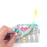 Keep happiness (and $20) right at your fingertips! This cute and compact keychain wallet is carefully crafted from Sun + Song's exclusive Sea Of Seahorses fabric. Our Sea Of Seahorses design features crisp white seahorses, all facing lemon yellow hearts, on a cool grey background. This fascinating creature, unique in its unwavering commitment to its mate, is considered a potent symbol of enduring love. Unzip the aqua blue zipper and - surprise - you'll find another vibrant pattern lining the inside!