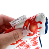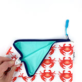 Don't settle for a boring bag! This highly functional and lively looking water-resistant wet bag is produced using Sun + Song's exclusive Crabby Crowd fabric. Our Crabby Crowd design features rows of orangey red crabs swimming around one rare and special navy blue crab, all on crisp white background. The scientific name for blue crab is the Callinectes sapidus, which can be translated from Latin to mean ‘beautiful savory swimmer’. Open up this bag's navy blue zipper to find a fun pop of aqua blue waterproof fabric lining the inside!