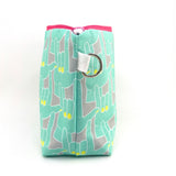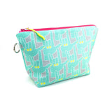 Your stylish solution for makeup storage! This happy and hip cosmetic bag is meticulously made using Sun + Song's exclusive Love Signs fabric. Our Love Signs design features layers of aqua blue hands forming the "I love you" sign in American Sign Language, each with lemon yellow fingernails on a cool grey background. A hot pink zipper vibrantly accents the pouch and opens up to a charcoal grey waterproof canvas interior.