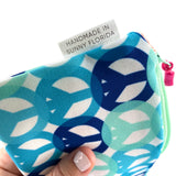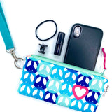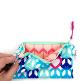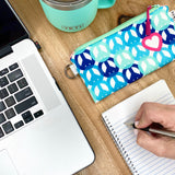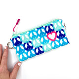 Bring a little brilliance to your everyday routine! This multicolored and multipurpose zipper pencil pouch is constructed from Sun + Song's exclusive Peace And Love fabric. Our Peace And Love design features overlapping peace signs in deep navy blue, rich turquoise blue and aqua blue with one specially placed hot pink heart. With one swipe of the aqua blue zipper you'll be delighted to find a second lively fabric lining the inside of this cutie!