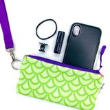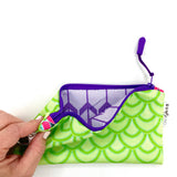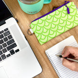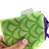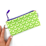 Bring a little brilliance to your everyday routine! This multicolored and multipurpose zipper pencil pouch is constructed from Sun + Song's exclusive Salty Scales fabric. Our Salty Scales design features geometric layers of fan shaped objects, inspired by fish scales, in light and medium chartreuse green with turquoise blue accents. With one swipe of the royal purple zipper you'll be delighted to find a second lively fabric lining the inside of this cutie!