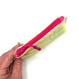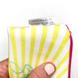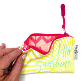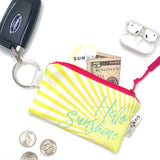 Keep happiness (and $20) right at your fingertips! This cute and compact keychain wallet is carefully crafted from Sun + Song's exclusive Hello Sunshine fabric. Our Hello Sunshine design features brushed text (Hello Sunshine) in aqua blue over lemon yellow rays of sunshine. Unzip the hot pink zipper and - surprise - you'll find another vibrant pattern lining the inside!