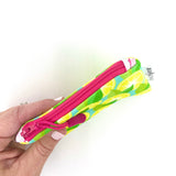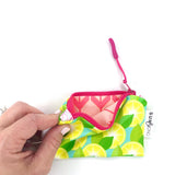 Keep happiness (and $20) right at your fingertips! This cute and compact keychain wallet is carefully crafted from Sun + Song's exclusive Lush Lemons fabric. Our Lush Lemons design features lemon yellow fruit slices and bright green leaves on an aqua blue background. Across many cultures, lemons are seen as symbols of healing and cleansing, both physically and spiritually. Unzip the hot pink zipper and - surprise - you'll find another vibrant pattern lining the inside!