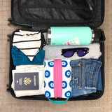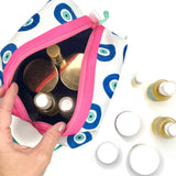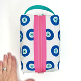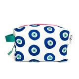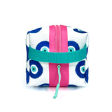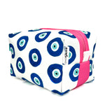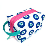 Boxy never looked so beautiful! This structured travel toiletry bag is fabricated with Sun + Song's exclusive Evil Eyes fabric. Our Evil Eyes design features a grid of hand painted and Evil Eye talismans in deep navy blue and rich turquoise blue on a crisp white background. This symbol of protection has been meaningful across many cultures for over 5000 years! The hot pink zipper wraps over the top and down part of each side, opening wide to reveal a charcoal grey waterproof canvas interior. Grab this pouch by its aqua blue handle and you're good to go!