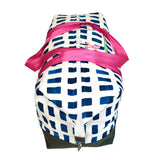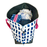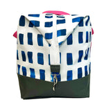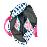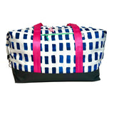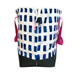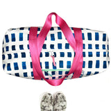 Take your whimsy with you when you go! This thoughtfully designed weekender tote is expertly sewn using Sun + Song's exclusive Painted Dashes fabric. Our Painted Dashes design features a linear repetition of hand painted deep navy blue dashes on a crisp white background. The hot pink straps and aqua blue zipper on the front pocket colorfully complete the exterior of this big bag. Inside you'll find low maintenance charcoal grey waterproof canvas lining and two large zipper pockets.
