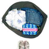 The bag's bottom and lining are made from a sturdy waterproof canvas - because you just never know! Two roomy interior zipper pockets (lined with a second accent Sun + Song fabric) give you a separate place for socks, undies, swimsuits, etc. The small zipper pocket on the front is the perfect spot for your passport or airline tickets.