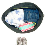 This weekender is so happy to look at that your vacation fun will start with the packing! This transformable bag is perfect for a short trip or family overnight. The top zipper extends past each side of the bag, allowing for a very wide, oval shaped opening. Once you are all packed: close the zipper, fold down the side corners, and secure the clips to the rings at the base of the bag. Now the weekender tote is a neat rectangular shape and the contents are being held securely in place (say goodbye to wrinkled clothes)!