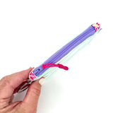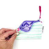 Keep happiness (and $20) right at your fingertips! This cute and compact keychain wallet is carefully crafted from Sun + Song's exclusive Studio Stripes fabric. Our Studio Stripes design features rows of hand painted wavy stripes in a minty aqua blue on a crisp white background. You can find these whimsical lines painted on Sun + Song's studio walls, where they create a lighthearted and playful feel. Unzip the lavender purple zipper and - surprise - you'll find another vibrant pattern lining the inside!