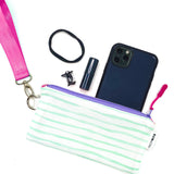 Want to show off your style? Clip on a Sun + Song wristlet strap (sold separately) to the sewn-in metal D ring and carry this pouch as a colorful clutch!