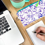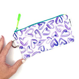 Bring a little brilliance to your everyday routine! This multicolored and multipurpose zipper pencil pouch is constructed from Sun + Song's exclusive Wild Hearts fabric. Our Wild Hearts design features a collection of hand painted and imperfect hearts in rich purple on a crisp white background. This design was inspired by Kimi's love for finding heart shapes in nature and where you're least expecting them. With one swipe of the teal blue zipper you'll be delighted to find a second lively fabric lining the inside of this cutie!