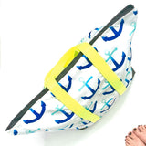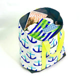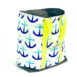 Make a bold statement with this big bag! This extra large and extra special water-resistant beach tote is handcrafted using Sun + Song's exclusive Anchors Away fabric. Our Anchors Away design features a linear repetition of anchors, each in a gradient from pale aqua blue to deep navy blue, all on a crisp white background. Anchors are a timeless symbol of hope, stability and strength. The neon yellow straps are a bright and fun accent, while the charcoal grey waterproof canvas lining is durable and low maintenance.