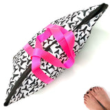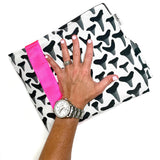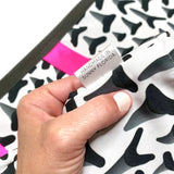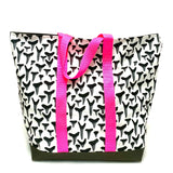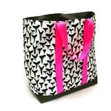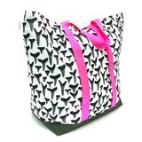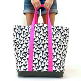 Make a bold statement with this big bag! This extra large and extra special water-resistant beach tote is handcrafted using Sun + Song's exclusive (and very special) Lisa's Shark Teeth fabric. Our Lisa's Shark Teeth design features various shapes of cool grey and black teeth on a crisp white background. These drawings are of actual shark teeth found on a Florida beach on May 4, 2021. The hot pink straps are a bright and fun accent, while the charcoal grey waterproof canvas lining is durable and low maintenance.