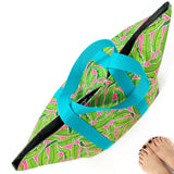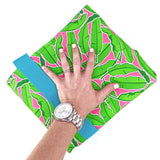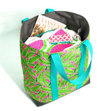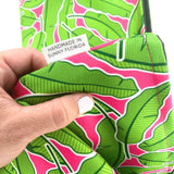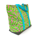 Make a bold statement with this big bag! This extra large and extra special water-resistant beach tote is handcrafted using Sun + Song's exclusive Banana Leaves fabric. Our Banana Leaves design features a collection of tropical banana leaves in lush greens on a hot pink background. These large curvy leaves hold significance in various cultures and are often associated with protection, growth, and renewal. The turquoise blue straps are a bright and fun accent, while the charcoal grey waterproof canvas lining is durable and low maintenance.
