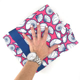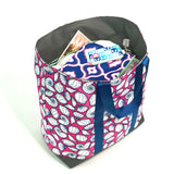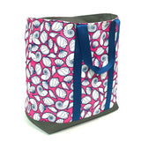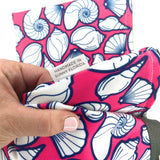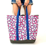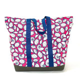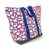 Make a bold statement with this big bag! This extra large and extra special water-resistant beach tote is handcrafted using Sun + Song's exclusive Sacred Seashells fabric. Our Sacred Seashells design features a mix of special seashells in deep navy blue and crisp white, floating on a hot pink background. Because shells serve as a defensive barrier for mollusks, many cultures have come to use them as a protective talisman to promote positivity and fend off negative energy. The deep blue straps are a bright and fun accent, while the charcoal grey waterproof canvas lining is durable and low maintenance.