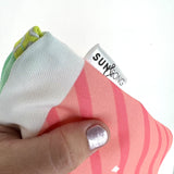 Don't settle for a boring bag! This highly functional and lively looking water-resistant wet bag is produced using Sun + Song's exclusive Hey Darlin' fabric. Our Hey Darlin' design features bold diagonal stripes in sun-kissed coral and peachy coral with crisp white letters on top (and is channeling your inner Dolly). Open up the aqua blue zipper to find a fun pop of lemon yellow waterproof fabric lining the inside!