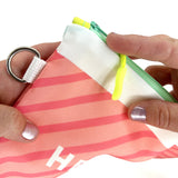 Want to show off your style? Clip on a Sun + Song wristlet strap (sold separately) to the sewn-in metal D ring and carry this pouch as a colorful clutch!