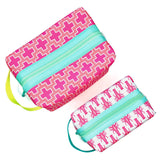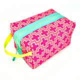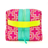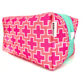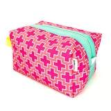 Big and boxy never looked so beautiful! This large structured travel toiletry bag is fabricated with Sun + Song's exclusive Preppy Plus Signs fabric. Our Preppy Plus Signs design features neat grid of hot pink and crisp white swiss cross symbols on sun-kissed coral background. The aqua blue zipper wraps over the top and down part of each side, opening wide to reveal a charcoal grey waterproof canvas interior. Grab this pouch by its neon yellow handle and you're good to go!