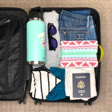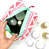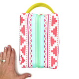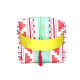 Boxy never looked so beautiful! This structured travel toiletry bag is fabricated with Sun + Song's exclusive Southwest Style fabric. Our Southwest Style design features a linear repeat with geometric shapes in hot pink, sun-kissed coral and peachy coral on a crisp white background. The aqua blue zipper wraps over the top and down part of each side, opening wide to reveal a charcoal grey waterproof canvas interior. Grab this pouch by its lemon yellow handle and you're good to go!
