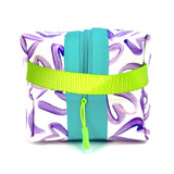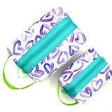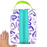 Big and boxy never looked so beautiful! This large structured travel toiletry bag is fabricated with Sun + Song's exclusive Wild Hearts fabric. Our Wild Hearts design features a collection of hand painted and imperfect hearts in rich purple on a crisp white background. This design was inspired by Kimi's love for finding heart shapes in nature and where you're least expecting them. The teal blue zipper wraps over the top and down part of each side, opening wide to reveal a charcoal grey waterproof canvas interior. Grab this pouch by its chartreuse green handle and you're good to go!