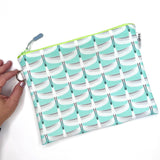 Don't settle for a boring bag! This highly functional and lively looking water-resistant wet bag is produced using Sun + Song's exclusive Captivating Cranes fabric. Our Captivating Cranes design features crisp white and cool grey birds gliding in neatly overlapping layers across an aqua blue background. One of the world's tallest flying birds, cranes stand as symbols of enlightenment, longevity, and peace. Open up this bag's chartreuse green zipper to find a fun pop of bright white waterproof fabric lining the inside!