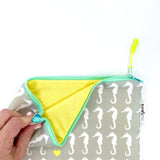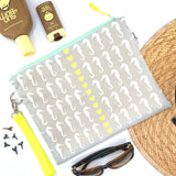 Don't settle for a boring bag! This highly functional and lively looking water-resistant wet bag is produced using Sun + Song's exclusive Sea Of Seahorses fabric. Our Sea Of Seahorses design features crisp white seahorses, all facing lemon yellow hearts, on a cool grey background. This fascinating creature, unique in its unwavering commitment to its mate, is considered a potent symbol of enduring love. Open up this bag's aqua blue zipper to find a fun pop of lemon yellow waterproof fabric lining the inside!
