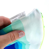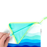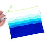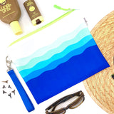 Don't settle for a boring bag! This highly functional and lively looking water-resistant wet bag is produced using Sun + Song's exclusive Ocean Waves fabric. Our Ocean Waves design features our modern take on gently rolling waves in a gradient from aqua blue to deep navy blue. Scientific research has proven that just being near the water can make you happier! Open up this bag's chartreuse green zipper to find a fun pop of aqua blue waterproof fabric lining the inside!