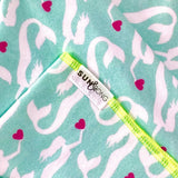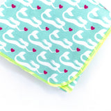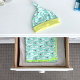 This super soft organic cotton knit swaddle blanket and hat set features Sun & Song's exclusive Mermaids design, with white mermaids holding hot pink hearts on an aqua blue background and a neon yellow accent border. New moms will find one million uses for this colorful baby blanket from newborn swaddle to nursing cover up to stroller blanket. With professionally serged edges and a nice stretch to the fabric, your little one will feel snug and secure when swaddled, helping to ensure a calm and happy baby. This lightweight blanket folds up easily so you can throw it in your diaper bag and take it with you anywhere!