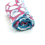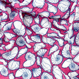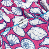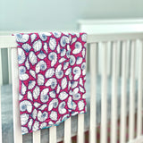 This lightweight organic cotton muslin baby blanket features Sun & Song's exclusive Seashells design, with navy blue and white seashells floating on a hot pink background and bordered in turquoise blue thread. There are one million uses for this colorful baby blanket from newborn swaddle to nursing cover up to your toddler's favorite snuggle blanket. Mom can even use it as a wrap or scarf! With professionally serged edges and a breathable muslin fabric, your little one will feel snug and secure without overheating. The gauze has a crinkly look and feel and only continues to get softer as it is used and washed.
