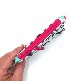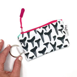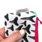 Keep happiness (and $20) right at your fingertips! This cute and compact keychain wallet is carefully crafted from Sun + Song's exclusive (and very special) Lisa's Shark Teeth fabric. Our Lisa's Shark Teeth design features various shapes of cool grey and black teeth on a crisp white background. These drawings are of actual shark teeth found on a Florida beach on May 4, 2021. Unzip the hot pink zipper and - surprise - you'll find another vibrant pattern lining the inside!