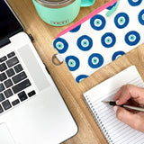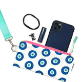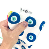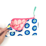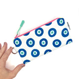 Bring a little brilliance to your everyday routine! This multicolored and multipurpose zipper pencil pouch is constructed from Sun + Song's exclusive Evil Eyes fabric. Our Evil Eyes design features a grid of hand painted and Evil Eye talismans in deep navy blue and rich turquoise blue on a crisp white background. This symbol of protection has been meaningful across many cultures for over 5000 years! With one swipe of the hot pink zipper you'll be delighted to find a second lively fabric lining the inside of this cutie!
