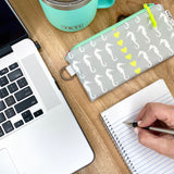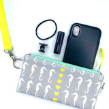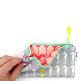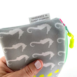 Bring a little brilliance to your everyday routine! This multicolored and multipurpose zipper pencil pouch is constructed from Sun + Song's exclusive Sea Of Seahorses fabric. Our Sea Of Seahorses design features crisp white seahorses, all facing lemon yellow hearts, on a cool grey background. This fascinating creature, unique in its unwavering commitment to its mate, is considered a potent symbol of enduring love. With one swipe of the aqua blue zipper you'll be delighted to find a second lively fabric lining the inside of this cutie!