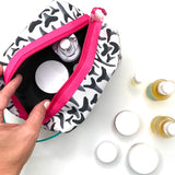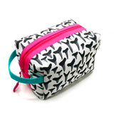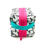 Boxy never looked so beautiful! This structured travel toiletry bag is fabricated with Sun + Song's exclusive (and very special) Lisa's Shark Teeth fabric. Our Lisa's Shark Teeth design features various shapes of cool grey and black teeth on a crisp white background. These drawings are of actual shark teeth found on a Florida beach on May 4, 2021. The hot pink zipper wraps over the top and down part of each side, opening wide to reveal a charcoal grey waterproof canvas interior. Grab this pouch by its turquoise blue handle and you're good to go!