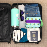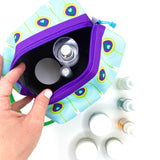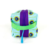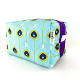 Boxy never looked so beautiful! This structured travel toiletry bag is fabricated with Sun + Song's exclusive Peacock Feathers fabric. Our Peacock Feathers design features layers of intricate feathers in rich turquoise blue, chartreuse green and bright purple. Throughout history, peacocks have been seen as symbols of royalty due to their beauty, confidence and wisdom. The bright purple zipper wraps over the top and down part of each side, opening wide to reveal a charcoal grey waterproof canvas interior. Grab this pouch by its chartreuse green handle and you're good to go!