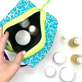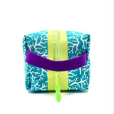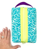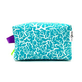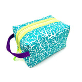 Boxy never looked so beautiful! This structured travel toiletry bag is fabricated with Sun + Song's exclusive Coral Reef fabric. Our Coral Reef design features a maze of bright white ocean coral on a rich turquoise blue background (don't miss the heart hidden in the design).  Symbolizing the eternal nature of life, coral is often seen as the guardian of the seas. The chartreuse green zipper wraps over the top and down part of each side, opening wide to reveal a charcoal grey waterproof canvas interior. Grab this pouch by its royal purple handle and you're good to go!