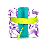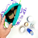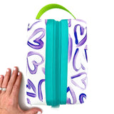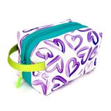 Boxy never looked so beautiful! This structured travel toiletry bag is fabricated with Sun + Song's exclusive Wild Hearts fabric. Our Wild Hearts design features a collection of hand painted and imperfect hearts in rich purple on a crisp white background. This design was inspired by Kimi's love for finding heart shapes in nature and where you're least expecting them. The teal blue zipper wraps over the top and down part of each side, opening wide to reveal a charcoal grey waterproof canvas interior. Grab this pouch by its chartreuse green handle and you're good to go!