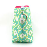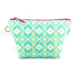 Your stylish solution for makeup storage! This happy and hip cosmetic bag is meticulously made using Sun + Song's exclusive Woven Chain fabric. Our Woven Chain design features curvy yet geometric lines in lemon yellow and crisp white, weaving in and out of each other over an aqua blue background. A hot pink zipper vibrantly accents the pouch and opens up to a charcoal grey waterproof canvas interior.