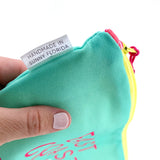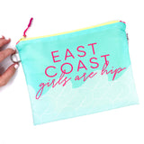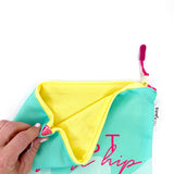 Don't settle for a boring bag! This highly functional and lively looking water-resistant wet bag is produced using Sun + Song's exclusive East Coast Girls fabric. Our East Coast Girls design features hot pink text (East Coast Girls Are Hip) and white geometric waves over an aqua blue background. Open up this bag's lemon yellow zipper to find a fun pop of lemon yellow waterproof fabric lining the inside!