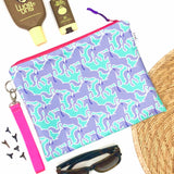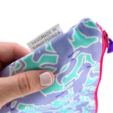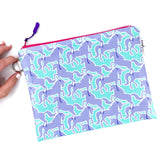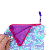Don't settle for a boring bag! This highly functional and lively looking water-resistant wet bag is produced using Sun + Song's exclusive Unicorns fabric. Our Unicorns design features lavender purple unicorns in overlapping layers on an aqua blue background. Open up this bag's hot pink zipper to find a fun pop of bright purple waterproof fabric lining the inside!