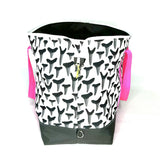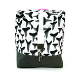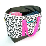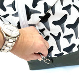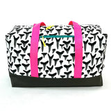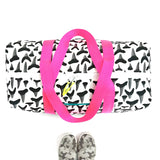 Take your whimsy with you when you go! This thoughtfully designed weekender tote is expertly sewn using Sun + Song's exclusive (and very special) Lisa's Shark Teeth fabric. Our Lisa's Shark Teeth design features various shapes of cool grey and black teeth on a crisp white background. These drawings are of actual shark teeth found on a Florida beach on May 4, 2021. The hot pink straps and turquoise blue zipper on the front pocket colorfully complete the exterior of this big bag. Inside you'll find low maintenance charcoal grey waterproof canvas lining and two large zipper pockets.