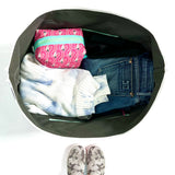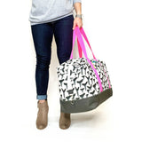 This weekender is so happy to look at that your vacation fun will start with the packing! This transformable bag is perfect for a short trip or family overnight. The top zipper extends past each side of the bag, allowing for a very wide, oval shaped opening. Once you are all packed: close the zipper, fold down the side corners, and secure the clips to the rings at the base of the bag. Now the weekender tote is a neat rectangular shape and the contents are being held securely in place (say goodbye to wrinkled clothes)!