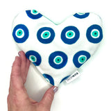 Ah, it's time to relax... and our Aromatherapy Weighted Eye Pillow has got you covered! This heart shaped therapeutic tool features Sun + Song's exclusive Evil Eyes design printed on ultra soft velvet. Our Evil Eyes design features a grid of hand painted and Evil Eye talismans in deep navy blue and rich turquoise blue on a crisp white background. This symbol of protection has been meaningful across many cultures for over 5000 years! The opposite side of this mask is a coordinating aqua blue printed on shiny, smooth satin. Each eye pillow is filled with the perfect 8 oz. combination of organic lavender and organic flaxseed, creating a comforting but gentle pressure.