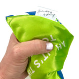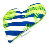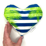 Ah, it's time to relax... and our Aromatherapy Weighted Eye Pillow has got you covered! This heart shaped therapeutic tool features Sun + Song's exclusive Palm Fronds And Stripes design printed on ultra soft velvet. Our Palm Fronds And Stripes design features lush green fronds over deep navy blue and crisp white stripes. The opposite side of this mask is a coordinating chartreuse green printed on shiny, smooth satin. Each eye pillow is filled with the perfect 8 oz. combination of organic lavender and organic flaxseed, creating a comforting but gentle pressure.