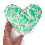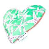 Ah, it's time to relax... and our Aromatherapy Weighted Eye Pillow has got you covered! This heart shaped therapeutic tool features Sun + Song's exclusive Starfish Social design printed on ultra soft velvet. Our Starfish Social design features a random sea of crisp white starfish with hot pink accents floating on an aqua blue background. While the symbolic meanings of starfish are vast and varied, they are most often used to represent new beginnings, new life, and new hope. The opposite side of this mask is a coordinating peachy coral printed on shiny, smooth satin. Each eye pillow is filled with the perfect 8 oz. combination of organic lavender and organic flaxseed, creating a comforting but gentle pressure.