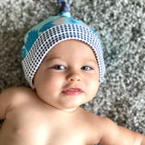 This soft and stretchy organic cotton knit baby hat features Sun & Song's exclusive Aztec design, our take on a classic tribal style in aqua, turquoise, pale grey, charcoal and navy blue. With professionally serged seams and a nice stretch to the fabric, this hat will be cozy and snug on your little one. This picture perfect accessory is available in 2 sizes for your quickly growing bundle of joy!