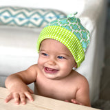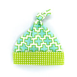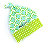 This soft and stretchy organic cotton knit baby hat features Sun & Song's exclusive Swiss Cross design with aqua blue plus signs outlined in lime green. With professionally serged seams and a nice stretch to the fabric, this hat will be cozy and snug on your little one. This picture perfect accessory is available in 2 sizes for your quickly growing bundle of joy!