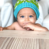 This soft and stretchy organic cotton knit baby hat features Sun & Song's exclusive Banana Leaves design, with tropical green leaves on a crisp white background with a turquoise blue border. With professionally serged seams and a nice stretch to the fabric, this hat will be cozy and snug on your little one. This picture perfect accessory is available in 2 sizes for your quickly growing bundle of joy!